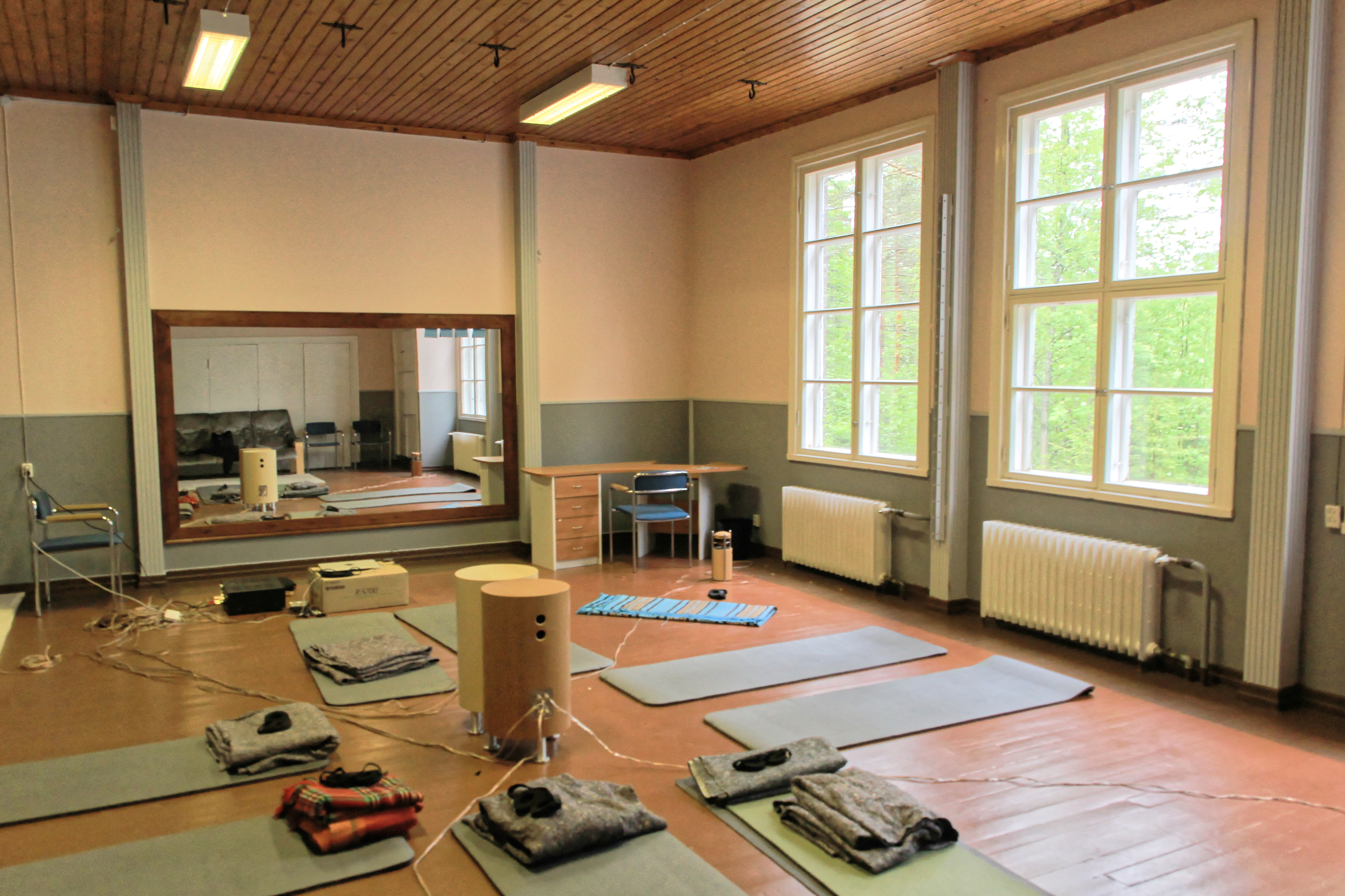 Before the session, Markus set up the whole equipment, this included four speakers, each in a corner of the room, with two big speakers in the centre of room, to give a 3D sound sensation. We started the session with some exercises, to loosen the body up and to relax ourselves. Later, Catarina gave us blindfolds and blankets, making us lay on soft mats as Markus went to the computer to begin the nature sounds, which were composed and recorded by Markus itself from all over the world. When we all had laid down, Markus began the live composition, which immediately immersed us in a different time and place, making us believe like we were there, with nature itself. I speak for myself when I say this, but maybe even for the others that were there. The experience was mind boggling and very relaxing, it made me focus better and concentrate on things that were important and had to be done. But it also made me realize, how beautiful is nature, how we are ruining it and how we need to treat it better. In conclusion it is a must have experience that will change and at the same time relax you.